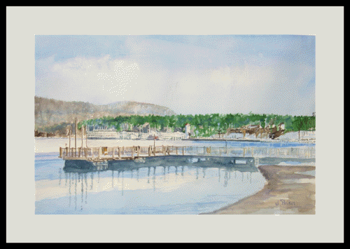 The image is of Lake George, the tour boats in ice in the background and the fort to the right. It's open water around the dock in the foreground and you are looking from the beach in the park on Main Street.