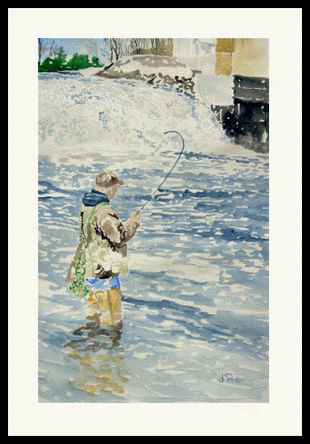 This image captures the image of a Fly Fisherman on the "Opening Day" of Trout Season on the river as it flows just below the falls.